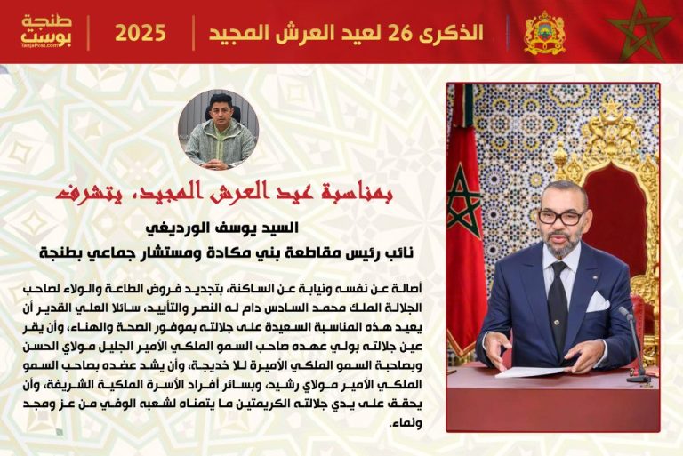 ✅ تهنئة السيد يوسف الورديغي، نائب رئيس مقاطعة بني مكادة ومستشار جماعي بطنجة، لجلالة الملك محمد السادس بمناسبة عيد العرش المجيد