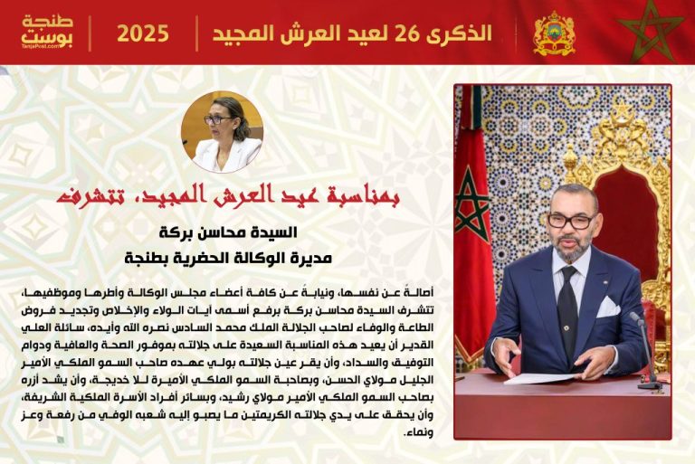 بمناسبة حلول الذكرى السادسة والعشرين لتربع صاحب الجلالة الملك محمد السادس نصره الله وأيده على عرش أسلافه المنعمين، وفي أجواء يملؤها الفخر والاعتزاز، تتشرف السيدة محاسن بركة، مديرة الوكالة الحضرية بطنجة، أصالة عن نفسها ونيابة عن كافة أطر وموظفي الوكالة، بأن ترفع إلى السدة العالية بالله أسمى عبارات التهاني وأصدق مشاعر الولاء والإخلاص.